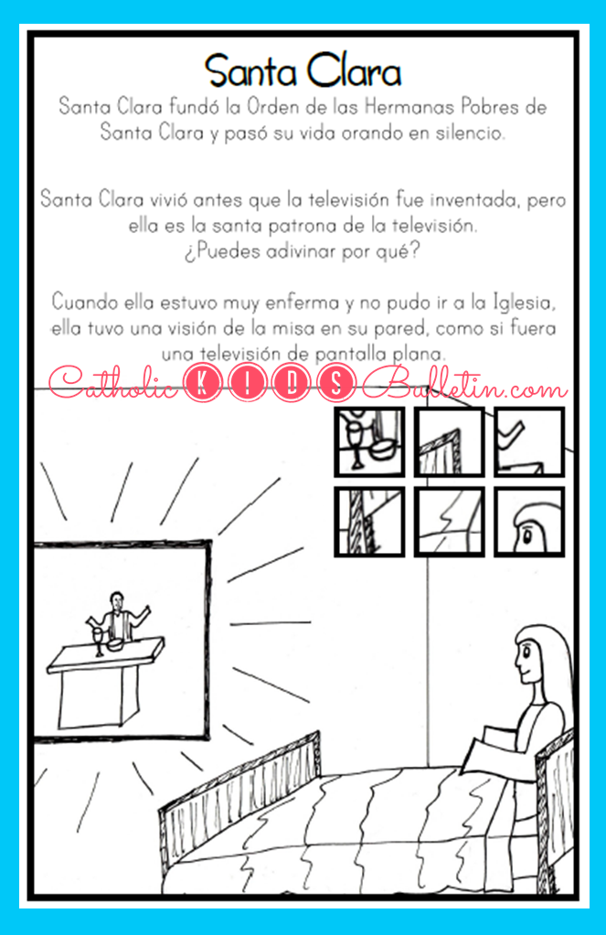 Saint of the Week: Saint Clare This week’s bulletin story explains why Saint Clare is the patron saint of TV. It’s always fun to surprise kids with unexpected saints! Catholic Online explains another miraculous episode in Saint Clare’s life if you want to click on over and check that out.   Speaking of Saints…in the Saint Story about Saint John Bosco, the kids can read more about the meaning behind the Miracle of the Loaves and Fishes.