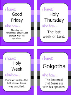I used the Lent “I have…who has…” with my Junior High kiddos this week. I gave each of them a set of the cards and had them sort them in order. I thought that most of the kids in that class had their Holy Week facts down, but a few of the kids really struggled to answer each question. More reteaching this week!