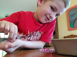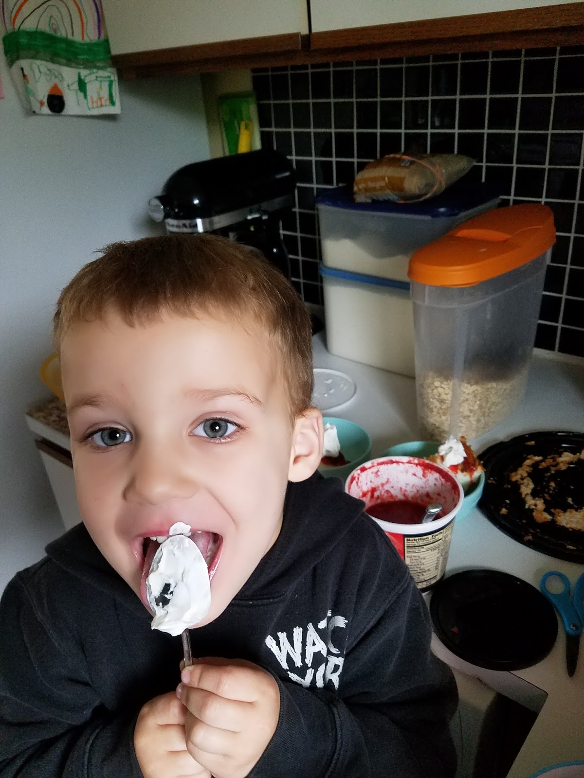 Nick wandered into the kitchen earlier this week an when I went to check on him 5 minutes later–he was making dessert! He had put together 5 bowls of angel food cake, strawberries, and cool whip. It doesn’t get any cuter than this! (Don’t worry, he didn’t lick the spoon until the end…I hope).