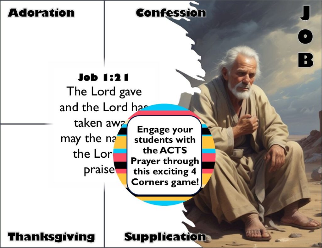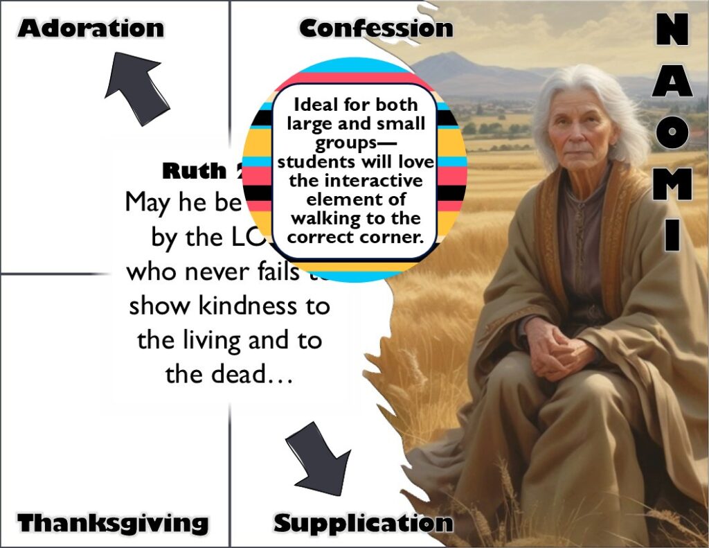 This year, I wanted to connect the ACTS Prayer to the Bible Timeline we’ve been working on, so I created a Four-Corners game with Bible verses spoken by our favorite Old Testament heroes. The game includes AI-generated images, allowing the kids to visualize who is speaking, and it provides another opportunity to connect the names of Old Testament figures to our lives today.