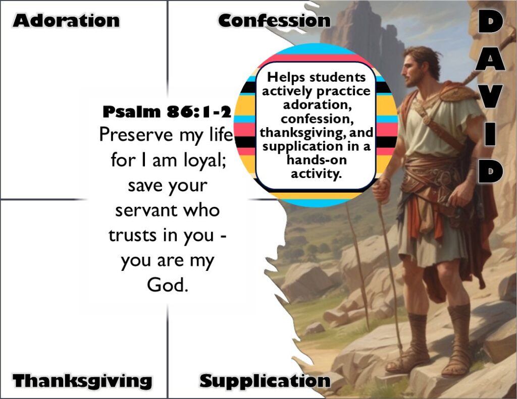 If you’ve already taught the ACTS Prayer (Adoration, Confession, Thanksgiving, and Supplication) to your students, January is a perfect time to take it to the next level. Help your kids go deeper by looking at Bible verses that reflect each part of the prayer. For example, Psalm 95:6 is a great verse for Adoration, while Philippians 4:6 ties into Supplication. Have them discuss why these verses fit each part of the ACTS Prayer and how they can use them in their own prayer lives. This not only reinforces the prayer structure but also helps kids connect their faith to God’s Word in a more meaningful way.