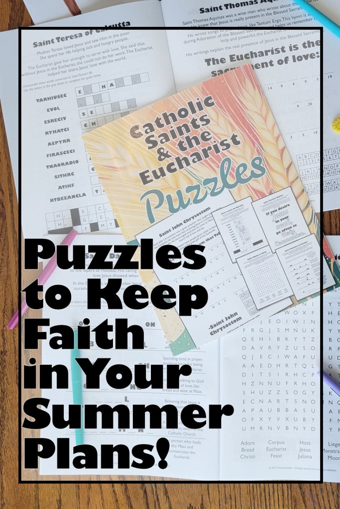 Check out Catholic Saints & The Eucharist Puzzle Book! It’s packed with fun word games, coloring pages, and brain teasers introducing kids to 23 amazing saints who loved the Eucharist.